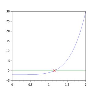 plot(X, X.^5-2, X, 0*X, r(5), 0, 'x')