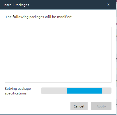 一个对话框显示为"Solving Package modifications",但经过一段时间后,该对话框显示为空白!