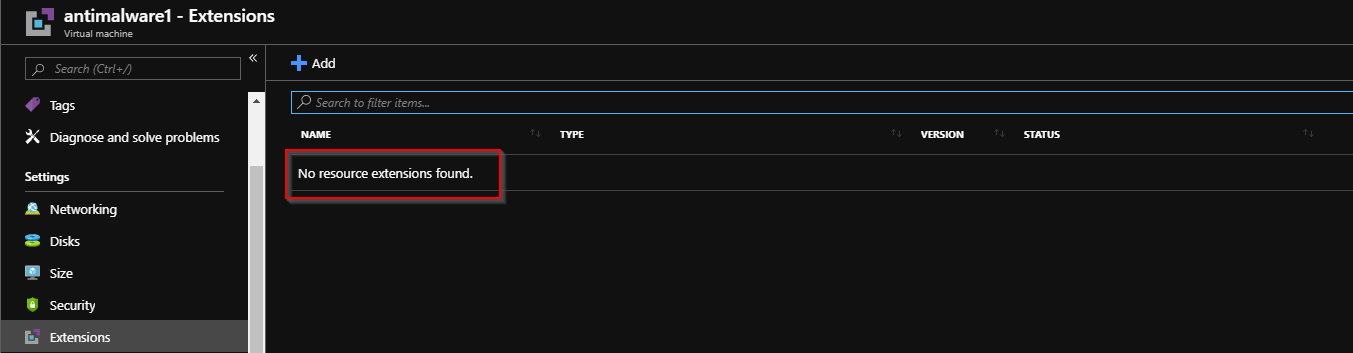 我创建了一个策略定义,以便在Windows机器上安装Microsoft反病毒扩展。当我转到VM >扩展时,没有扩展名: