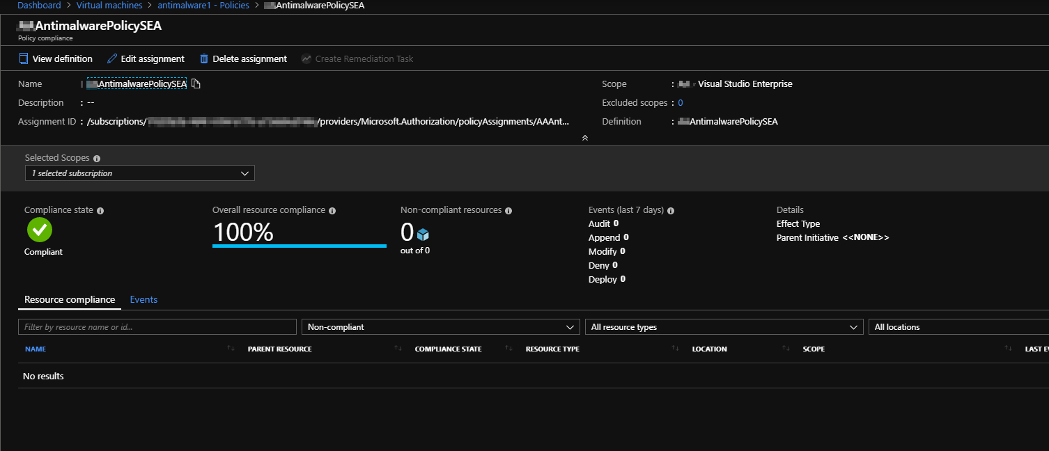 az policy assignment create --scope /subscriptions/xxxxxxxxxxxxxxxxxxxxxxxxxxxx --policy "Microsoft-Antimalware-extension-windows-server" 另外,注意,在定义策略并将其分配给订阅之后,我手动创建了VM。