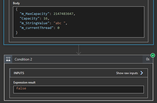当我查看蔚蓝函数输出时,在正文中,"m_StringValue"返回我想要的内容。当我在后面放一个条件来检查azure函数体是否返回了我想要的东西时,它会返回false。