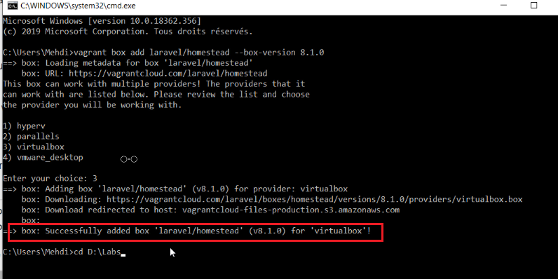 我已经为Laravel安装了一个Vagrant,遵循以下命令:vagrant box add laravel/homestead --box-version 8.1.0 (成功添加了box )