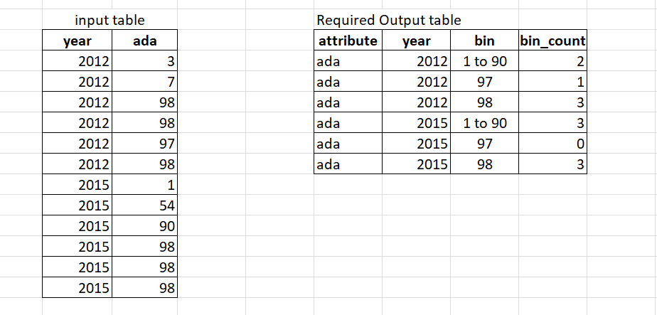 group by y.year, b.bin;https://stackoverflow.com/questions/58240288