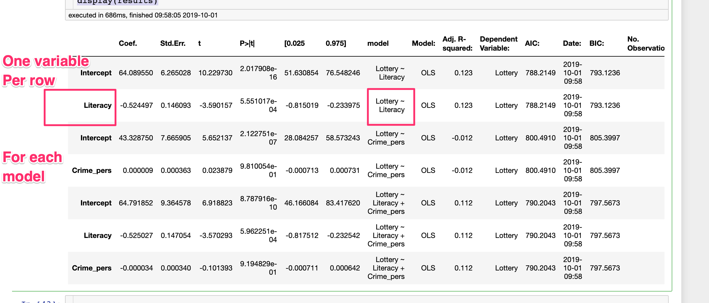 1 Literacy [2, 6, 3] [2, 3, 4]其中每个字段中的子列是(系数、t值、p值(它们目前不包含只是为简洁而组成的值的实际值))。对于记录0和two_variables,输出是NaN,因为只有没有显式调整的模型的值是相关的。