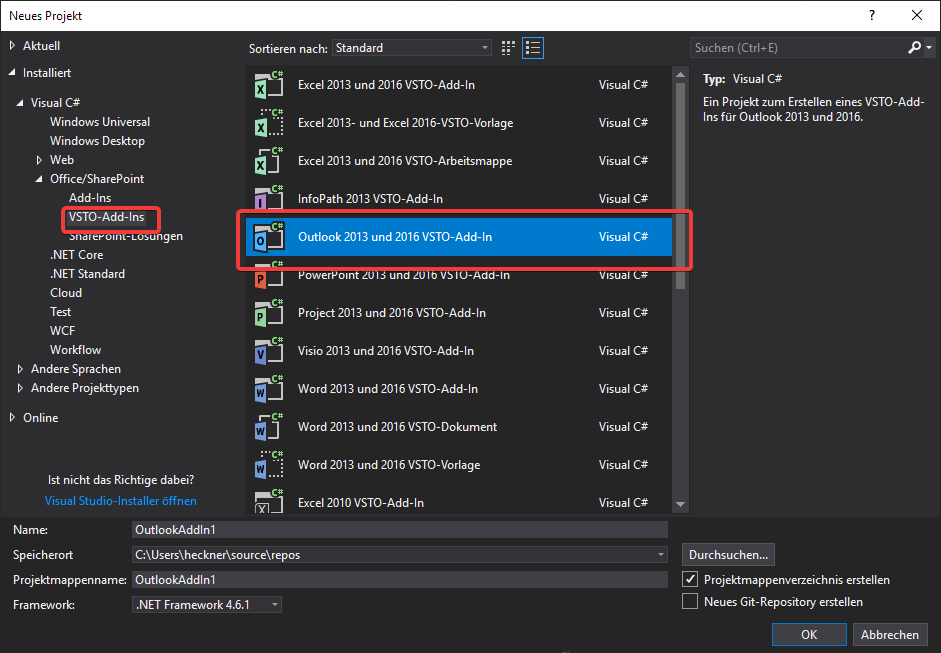我正在开发一个Outlook (VSTO,C#)。然后,我使用VS中的以下步骤创建了Addin : New->Project