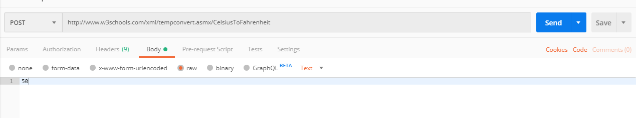 </form>所以我打电话给http://www.w3schools.com/xml/tempconvert.asmx/CelsiusToFahrenheit我试着用邮递员