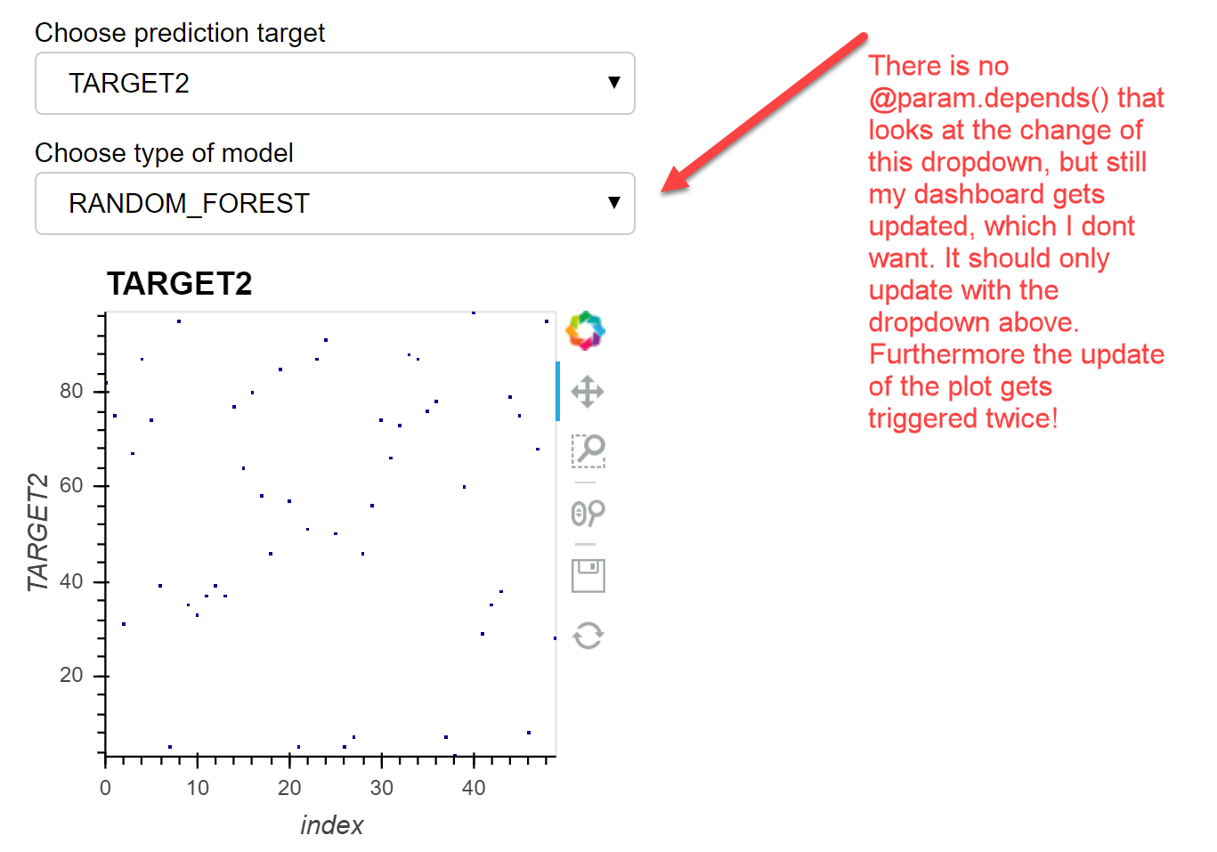 当我在下面的代码示例中更改下拉“choose_model_type”的值时,我希望仪表板中不会有任何变化,因为我的类中没有@param.depends('choose_model_type', watch=True)。但是,当我更改下拉“choose_model_type”的值时,仪表板就会更新。在本例中,如果查看日志,函数plot_y()将被触发两次: