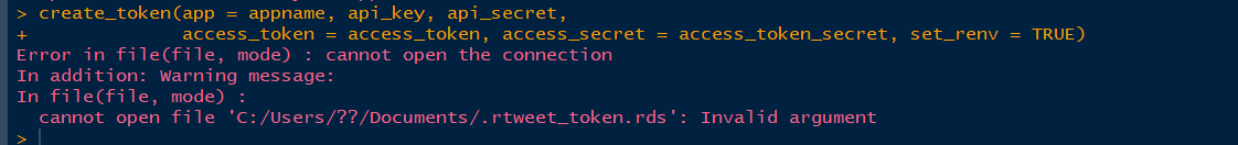 无法打开文件‘C:/User/??/Documents/..rtweet_Token.rds’:无效参数