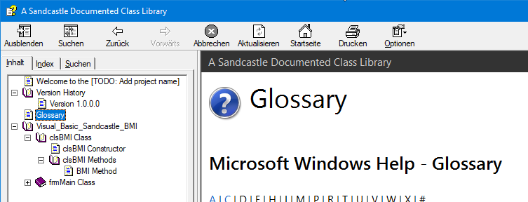 正如您在CHM屏幕截图中看到的,在我的BMI类文档之上有一个词汇表主题。此主题不在项目中,而是在另一个目录中。