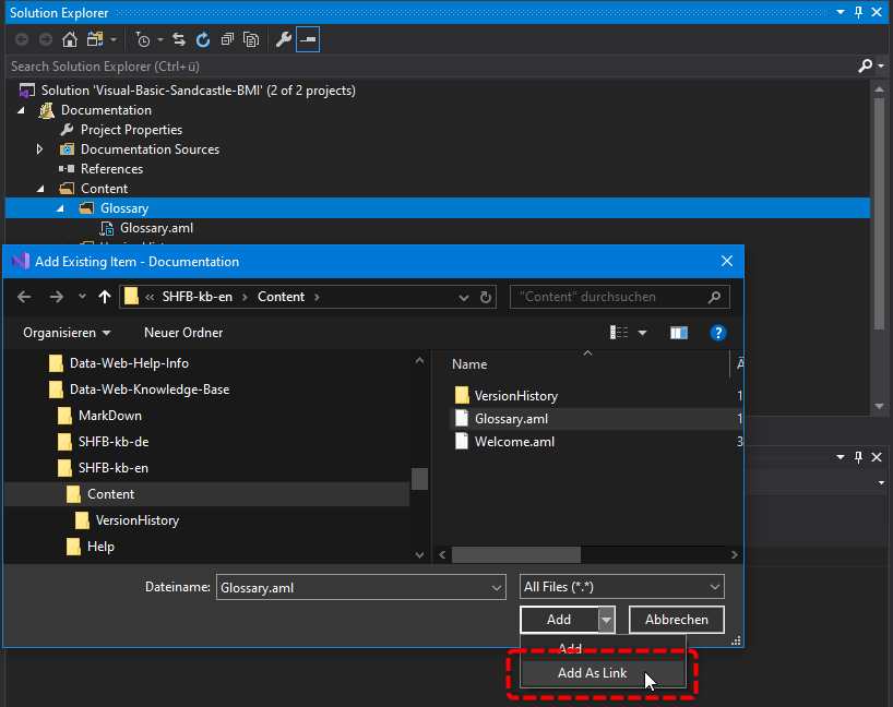 可以按照通常的方式在Visual中添加链接项。选择要添加现有项的选项,在“文件选择”对话框中,而不是单击“添加”按钮,单击其上的下拉箭头并选择“添加为链接”选项(如下图所示)。