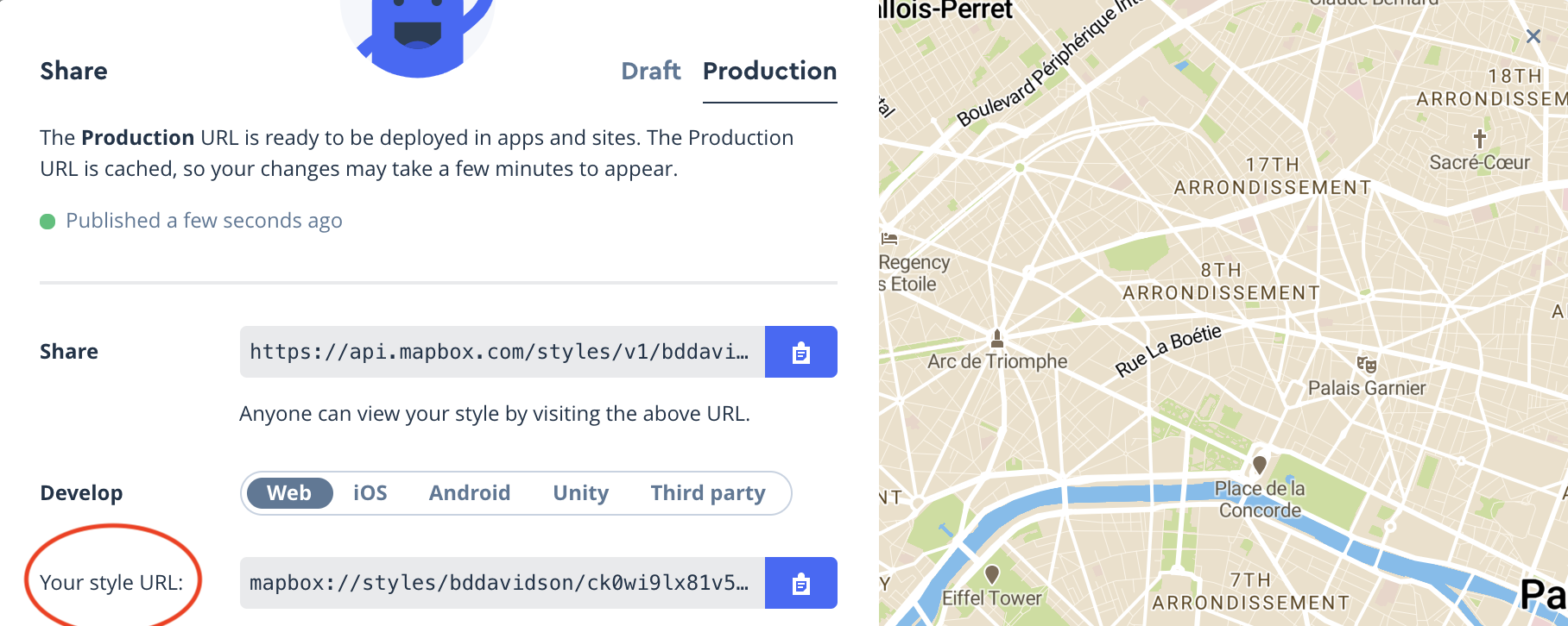 然后,您将看到一个面板,其中将有一个名为Your style url的部分。如果您复制该链接并将其粘贴到您的代码中,则您的样式应该可以通过。