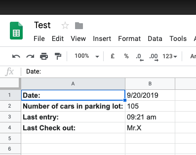 日期:,9/20/2019,停车场内的汽车数量:,105,最后一次登记:,09:21,最后退房:,先生,,,