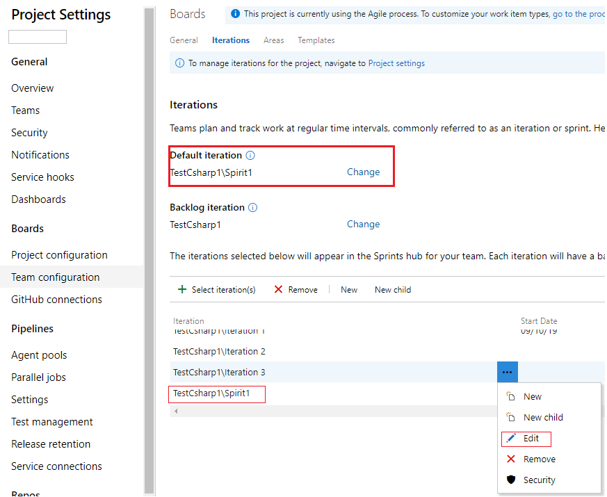 因此,如果您想在视觉上使用Spirits作为缺省值,可以在团队配置中添加名为灵性的新迭代,或者将现有迭代的名称更改为灵性样式。然后将其设置为默认迭代。如下图所示: