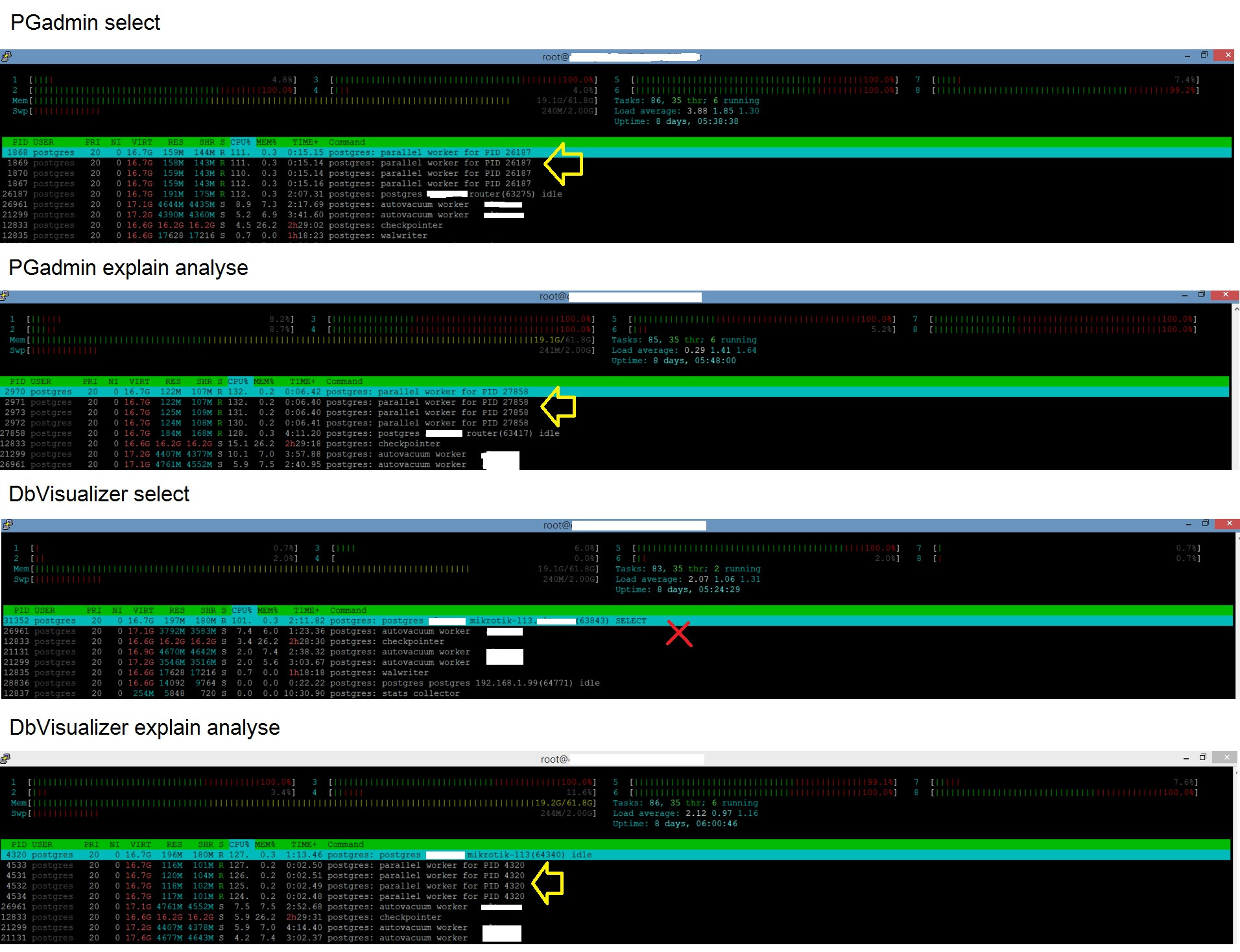 问题似乎与DbVisualizer有关,奇怪的是,如果我只是运行查询,它并不并行,但是当使用了解释分析选项时,我在服务器上检查这一点,即屏幕截图。