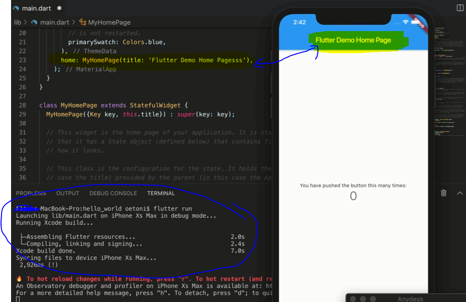 在屏幕截图中,main.dart文件似乎未保存(它在选项卡中有一个点)。如果未保存更改,则终端中的重新加载不会应用这些更改。