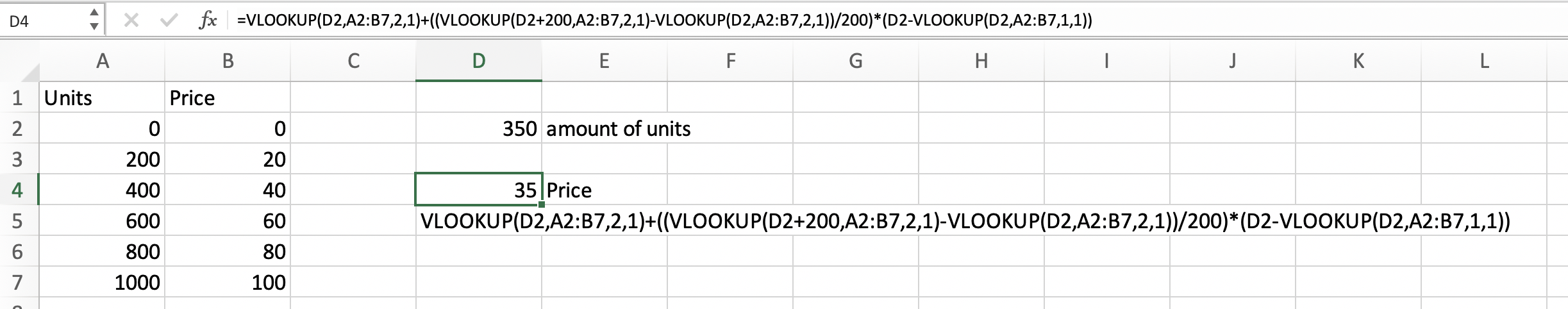 =VLOOKUP(D2,A2:B7,2,1)+((VLOOKUP(D2+200,A2:B7,2,1)-VLOOKUP(D2,A2:B7,2,1))/200)*(D2-VLOOKUP(D2,A2:B7,1,1))所以,一个插值公式,取最接近的最小值的价格,并增加额外的必要数额。