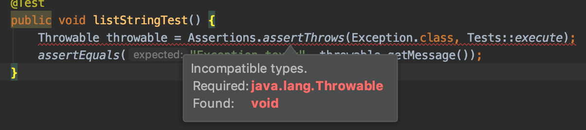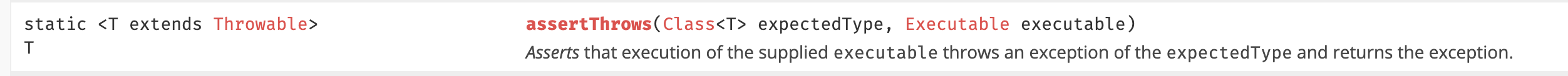 Throwable throwable = Assertions.assertThrows(Exception.class, Tests::execute);