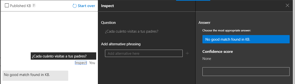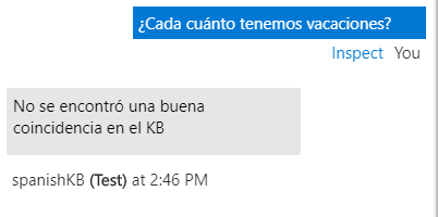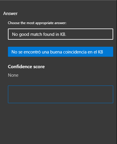 I在QnA Maker中用西班牙语创建了一个知识库。我在文档中读到,这是选择语言的方法。事实上,在我的Azure门户网站上,我发现它是“西班牙语”,不能修改。然而,无论是培训来自QnA制造商的网络界面和测试网络聊天,机器人在发现没有匹配的时用英语进行响应。
