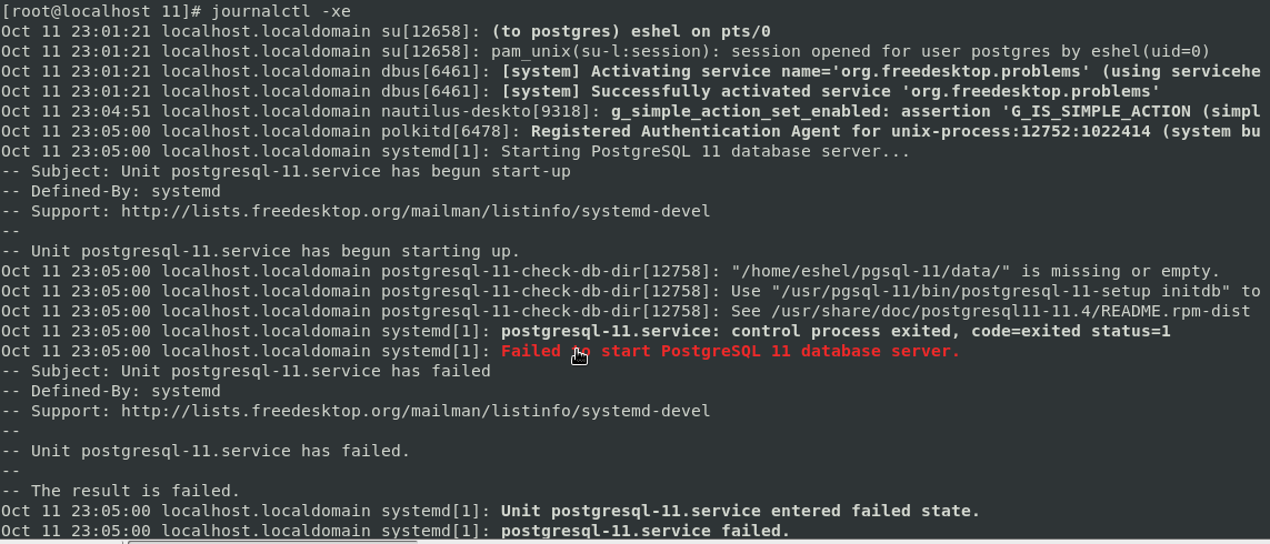 * Oct 11 23:05:00 localhost.localdomain systemd[1]: Failed to start PostgreSQL 11 database server.