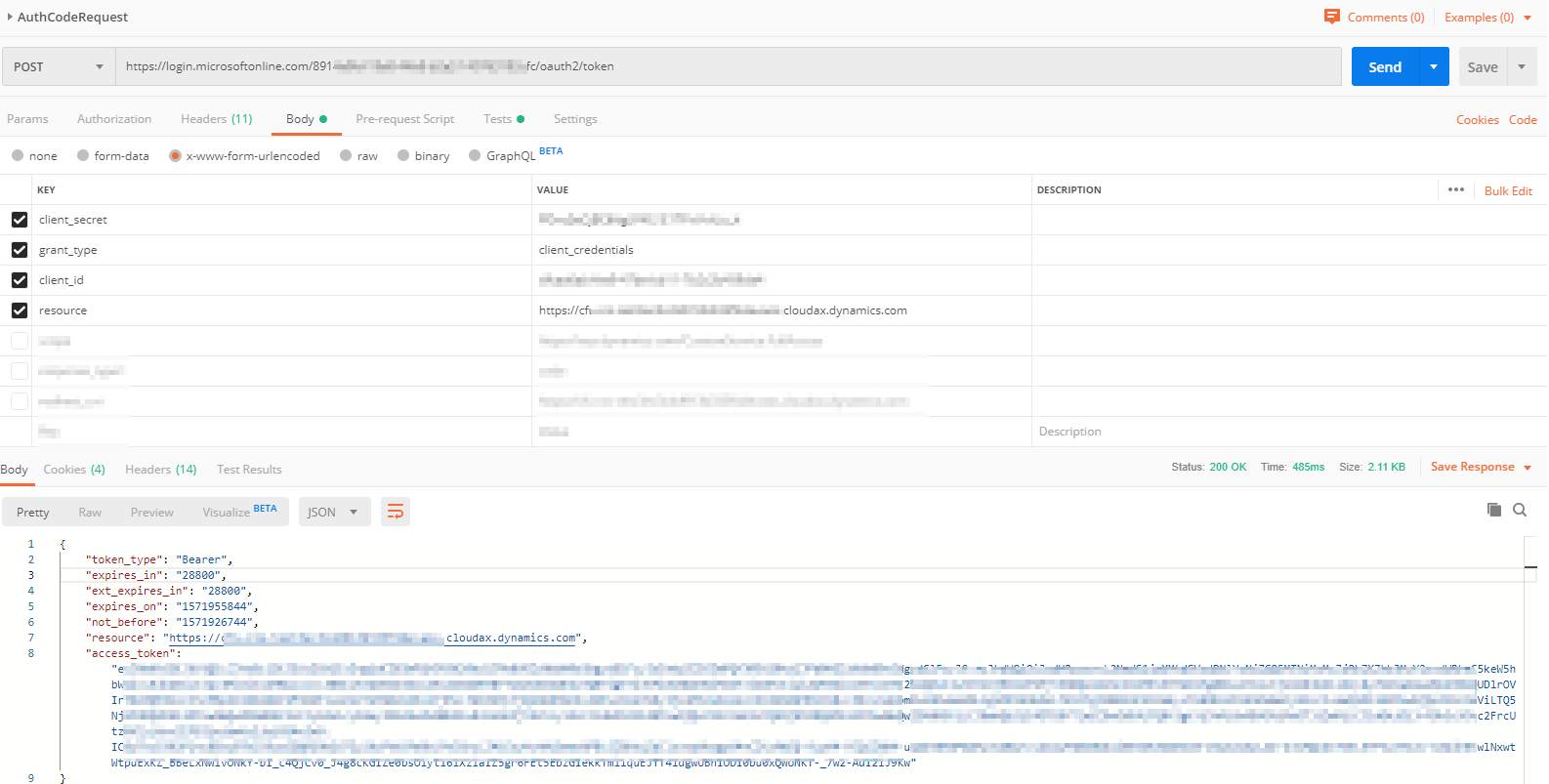 在请求resource令牌(并在https://jwt.io for aud (aud)字段中验证令牌)中验证OAuth。它应该与末尾没有/的主url相同(比如https://d365fo-10-12345678baef10230aos.cloudax.dynamics.com)。
