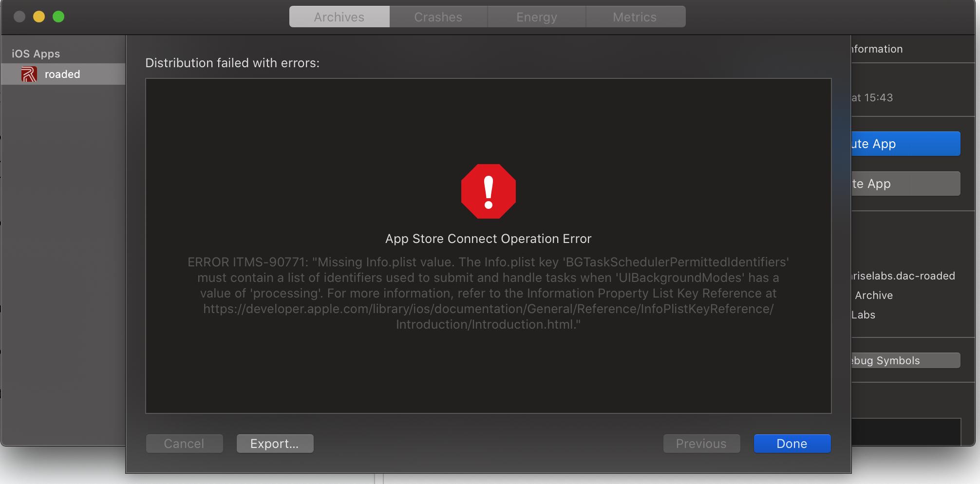 在info.plist中完成后台任务的标识符,应用程序可以将其存档并构建到app连接中,没有任何问题