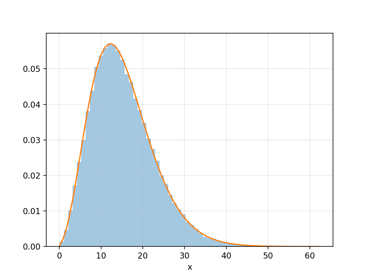这是另一个简短的脚本,演示非中心性参数实际上是正态分布平均值的平方和。它生成一个大样本的值,每个值是三个正态随机变量的平方和,均值分别为1、1.5和3。这个样本的分布应该是一个非中心的卡方,具有3个自由度,非中心性参数等于平均值的平方和。
