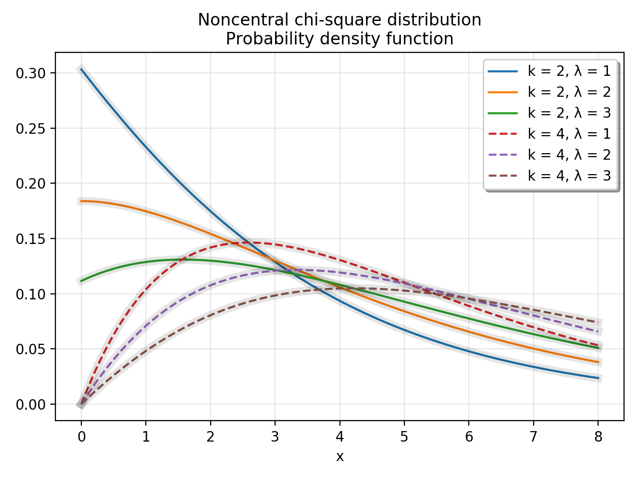 这里有一个脚本,它生成与维基百科页面中的情节相同的曲线。彩色线使用scipy.stats.ncx2.pdf计算,灰色线使用维基百科页面中无限级数的前10个项计算。图中将验证这些表达式是否只是相同值的不同表达式。
