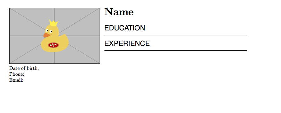 \hfill,以在它们之间得到一点空间--[width=\linewidth]选项。这将自动缩放图像正确的[T]和[b]来确定垂直对齐的showframe添加到您的几何选项中来可视化这一点,例如\geometry{a4paper, total={170mm,257mm}, left=10mm, top=10mm,showframe}。你确定这是简历的好选择吗?%Preamble