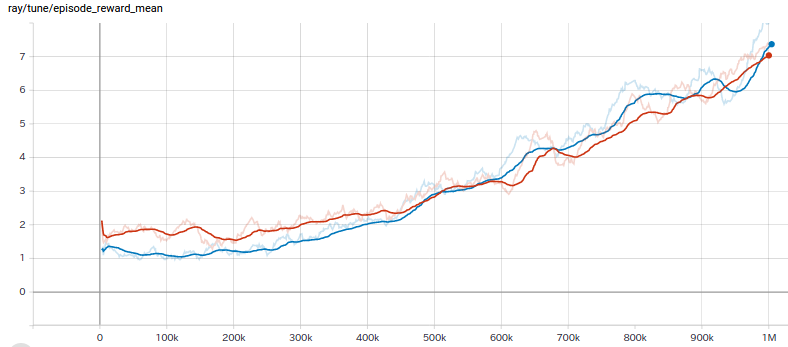 我已经做了一个快速测试,看起来奖励剪辑对突击队没有多大影响,至少在训练的早期(用蓝色剪裁,用橙色剪裁):