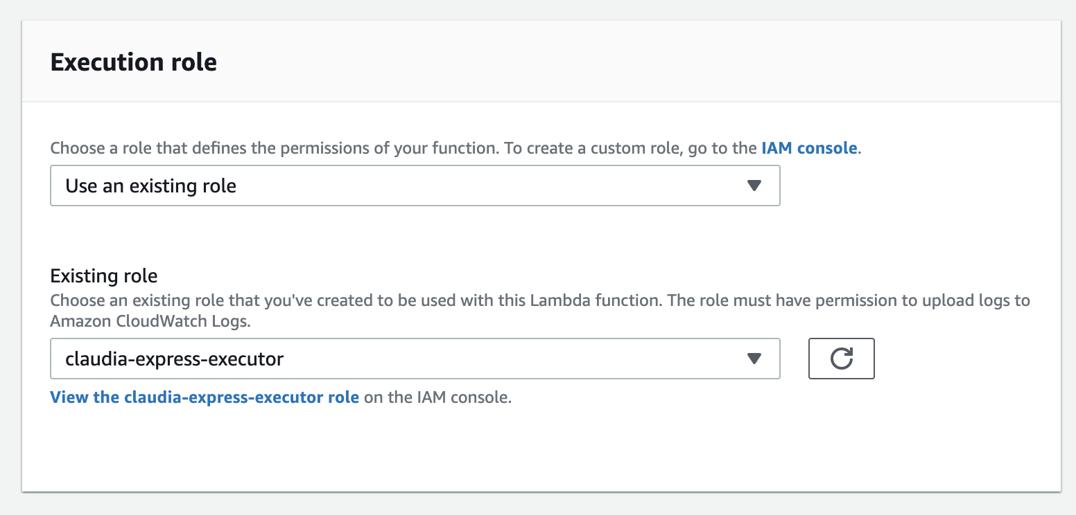 在这里你可以看到我的Lambda函数有一个角色"claudia-express-executor“。