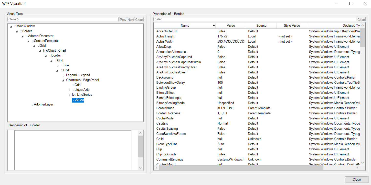 还有很多其他类似的工具来自第三方。一旦您在结构中找到需要更改的控件(在本例中,它是EdgePanel中的一个边框)。然后,您可以从后面的代码中更改此控件。您不能在构造函数中这样做,因为视觉树尚未在构造时加载。你可以在上膛的时候做。因此,您需要订阅图表控件上加载的事件(也可能订阅LayoutUpdate事件,因为在布局更新时,它可以恢复其原始值)。函数FindVisualChild帮助在可视树中按类型和名称查找控件。当我们找到边框时,我们要么使其透明(更安全的选项),要么使其厚度为0,但它可能会影响布局。我们也可以移除它,但是依赖它的东西可能会被打破。请注意,如果您更改主题,此代码可能会停止工作,因为它可能有不同的视觉树。