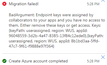 BadArgument:端点键由协作者分配给您的应用程序,您无法访问它们。要么删除这些密钥,要么获得访问权限。键:{keyPath:用户分配,区域: WUS,appId: 1234567890},{keyPath:用户分配,区域: WUS,appId: 1234567891}