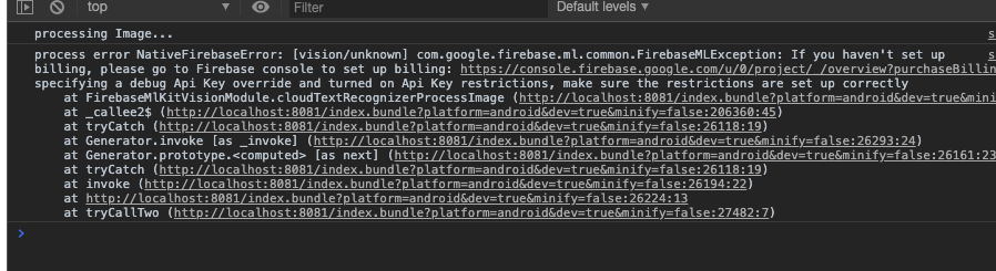 好吧我已经弄清楚了。对于设备上的,使用react本机防火墙-mlkit的,您必须使用textRecognizerProcessImage()函数而不是cloudTextRecognizerProcessImage()。