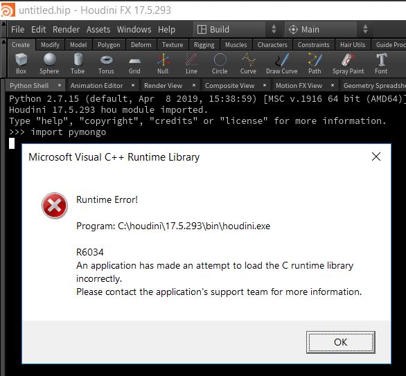 Microsoft Visual C++运行时库-运行时错误!程序:应用程序C:\houdini\17.5.293\bin\houdini.exe R6034试图错误地加载C运行时库。有关详细信息,请联系应用程序的支持团队。