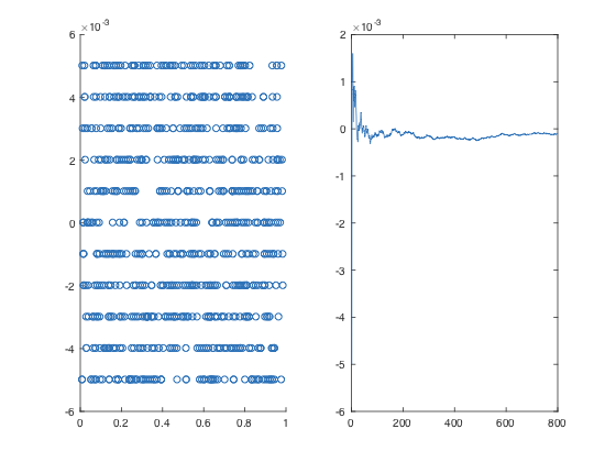 下面的代码是对OP中代码的修改,它做了错误与位置之间的散点图,以及OP的偏置图。第一幅图帮助识别上面的问题#2。我已经做了次抽样因子和次抽样变量的偏移量,我建议您使用这些值来了解正在发生的事情。我也做了最大随机的位置,以避免抽样偏差。注意,我还使用了N/factor而不是size(datapoints_downsampled,1)。如果N/factor不是整数,则下采样向量的大小是要使用的错误值。