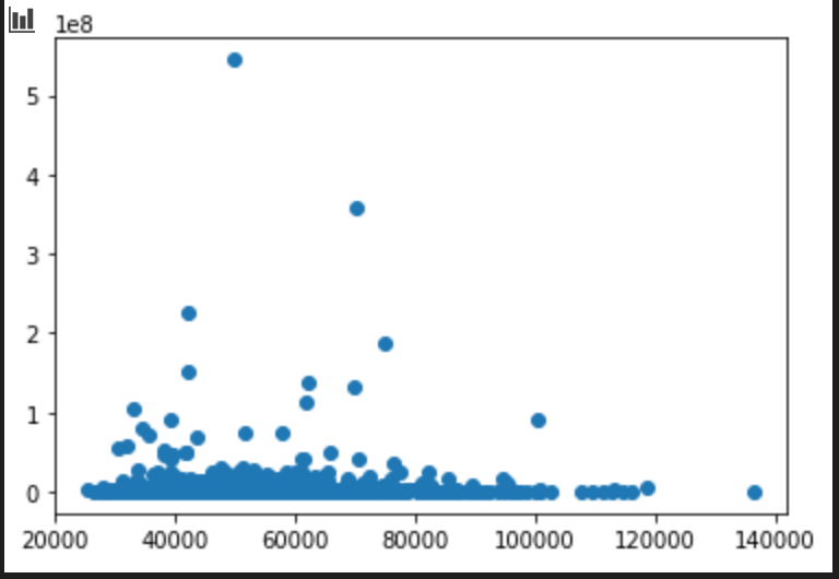 我有一些我正在做的学校项目的代码,我需要为按县和每个县对可持续能源实践投资的家庭收入中位数的数据创建散点图。例如,我的数据的前五行如下所示: