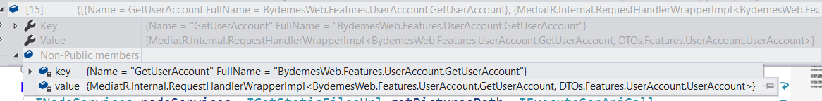 Controller -> MediatR_Request_0 -> MediatR Notification -> MediatR Request _1(the same as before) -> does not arrive to GetUserAccount Handler.我在前面的步骤( IMediator _requestsRouter )中检查了GetUserAccount处理程序,它的GetUserAccount处理程序注册如下: