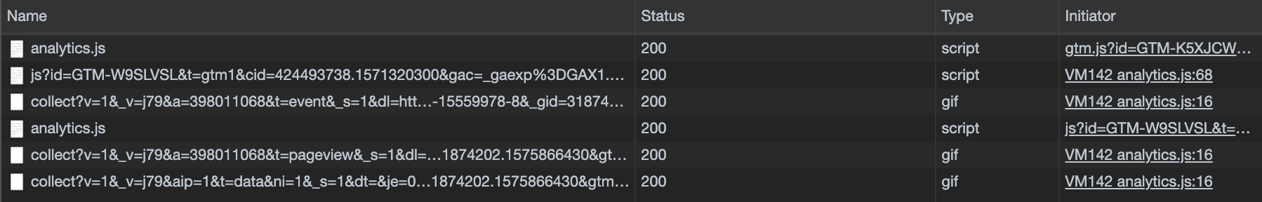 查看“网络”选项卡中的“启动器”选项卡,因为它看起来像是从几个不同的地方调用的analytics.js。即- gtm.js?id...和js?id....