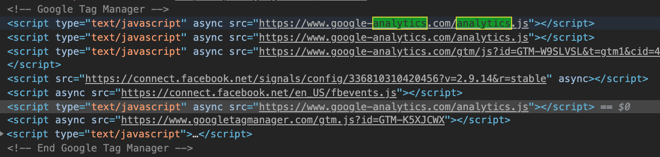 当我检查我的页面源代码时,我在Google代码块中看到多个analytics.js实例,请参见: