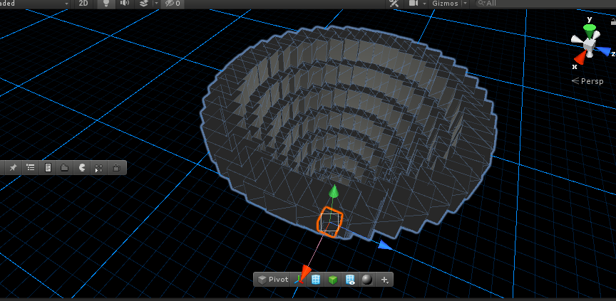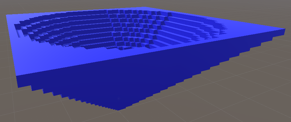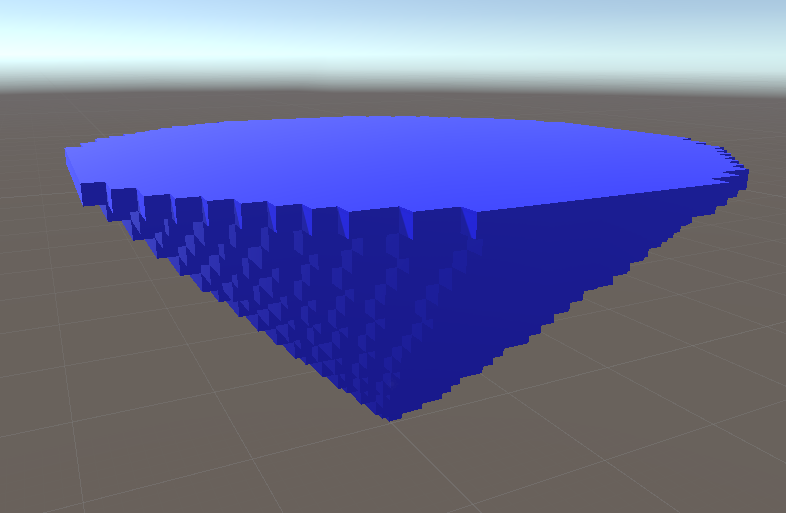 我试图在C#中创建一个体素样式的圆锥形状。我有锥建筑使用立方体,但无法解决如何只建立外层(使它空心),而不是建立一个固体锥,如图所示。