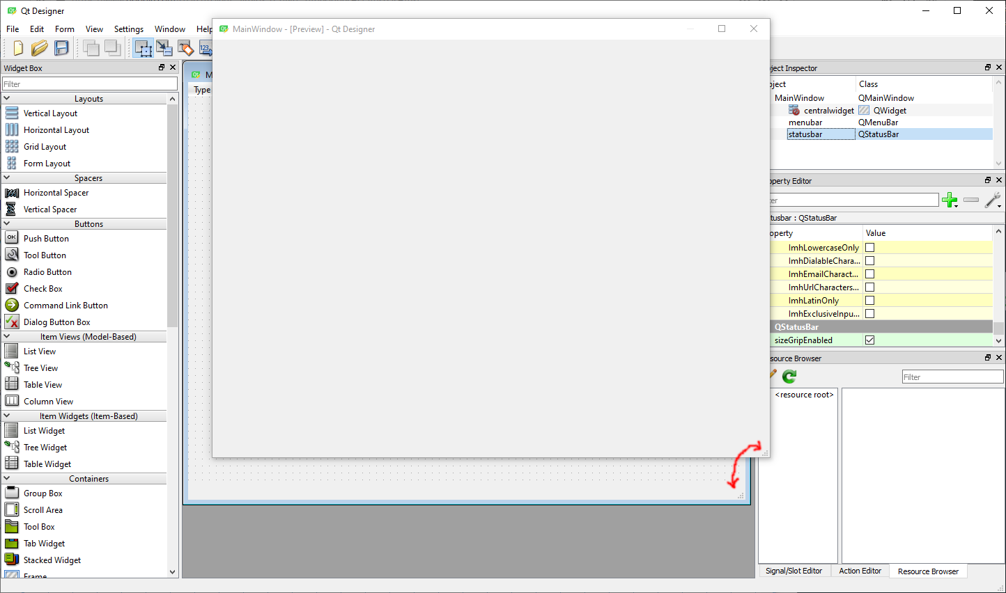 基本上,我唯一能看到的是"sizeGrip",它并不总是很容易看到--所以我也希望在statusbar中显示一个文本/消息。