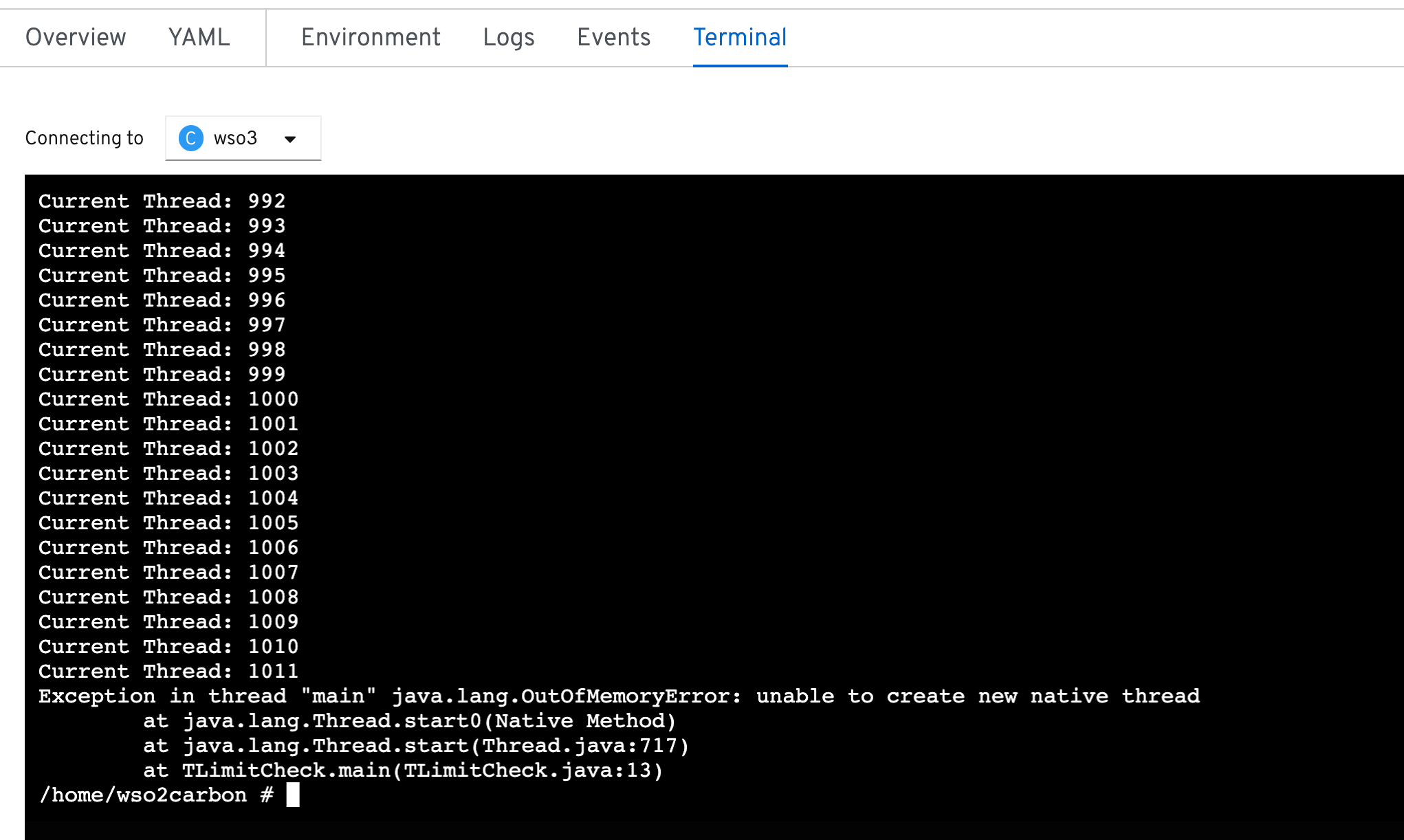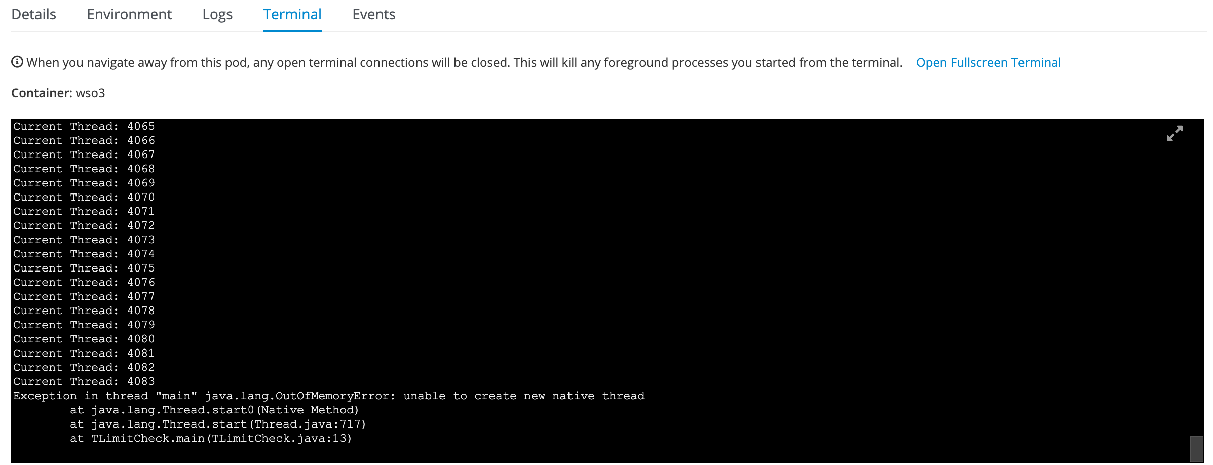 在Openshift 3.11中,同一个容器可以创建4096个线程。但是在Openshift 4.2中,它只能创建1024个线程。请看下面的图片
