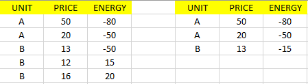 Unit具有全正或所有负能量值时,当相同的Unit有E 112正和负E 213E 213能量值时,结果保持相同的H 214G 215- Make a sum of all Energy for that `Unit`(-50+15+20 = -15) and then take the maximum of absolut value for the Energy.`e.g. max(abs(energy))=50` and take the price for that value.