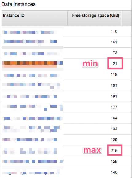 不同实例之间的空闲存储空间非常不平衡,我在AWS控制台中可以看到: