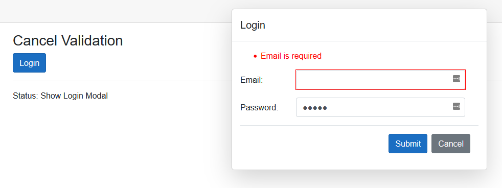 在EditContext对象中添加的表单验证支持在两个级别上执行:对象级和字段级。单击Submit按钮时,将验证整个模型。我们已经看到Submit按钮工作得非常好,并且不允许您提交,除非模型的字段的值是有效的。当您点击Cancel按钮,并且Model字段的值是有效的时,对话框就会被关闭,而不会出现问题。但是,当一个或多个字段的值无效(例如,在清除电子邮件字段之后),然后单击Cancel按钮,字段级别的验证就会立即启动,然后取消按钮的事件处理程序中的代码才有机会做一些事情。这种行为是通过设计进行的,甚至在我使用Fluent验证而不是DataAnnotations验证时也会重复。结论:这是我们的局限,而不是制度。我们需要投入更多的时间来学习Blazor。我建议的解决方案是在单击Cancel按钮时禁用字段级验证,从而立即关闭对话框,而不需要进行任何验证。