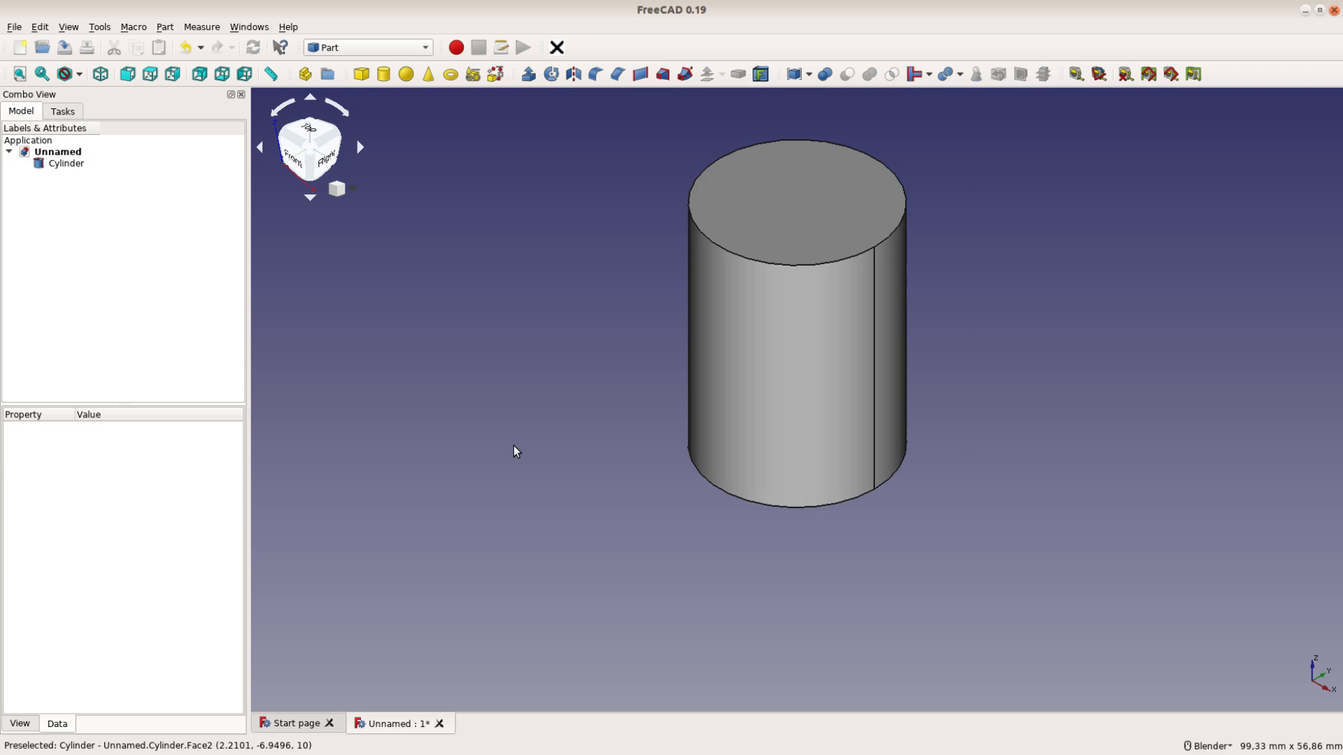 在工作台部件中,单击多维数据集图标部件Cylinder.png。默认情况下,一个完整的圆柱体被定位,一个圆形面的中心与全局原点(点0,0,0)一致,半径为2mm,高度为10 2mm。