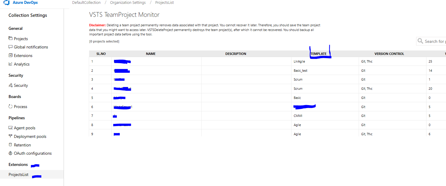 转到,搜索并安装扩展VSTS TeamProject监视器。安装后,您将看到ProjectList将被添加到Collection设置下的Extensions部分。