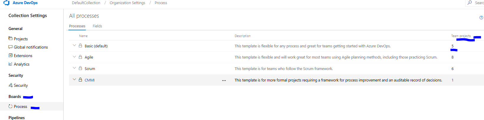 如果你不想安装上面的分机。您可以转到Board-> Process。在这里,您将在Team projects下看到每个流程的编号,这表明有多少项目正在使用该流程。您可以单击这些数字来检查这些项目是什么。