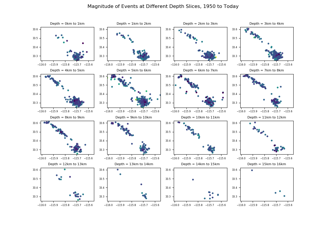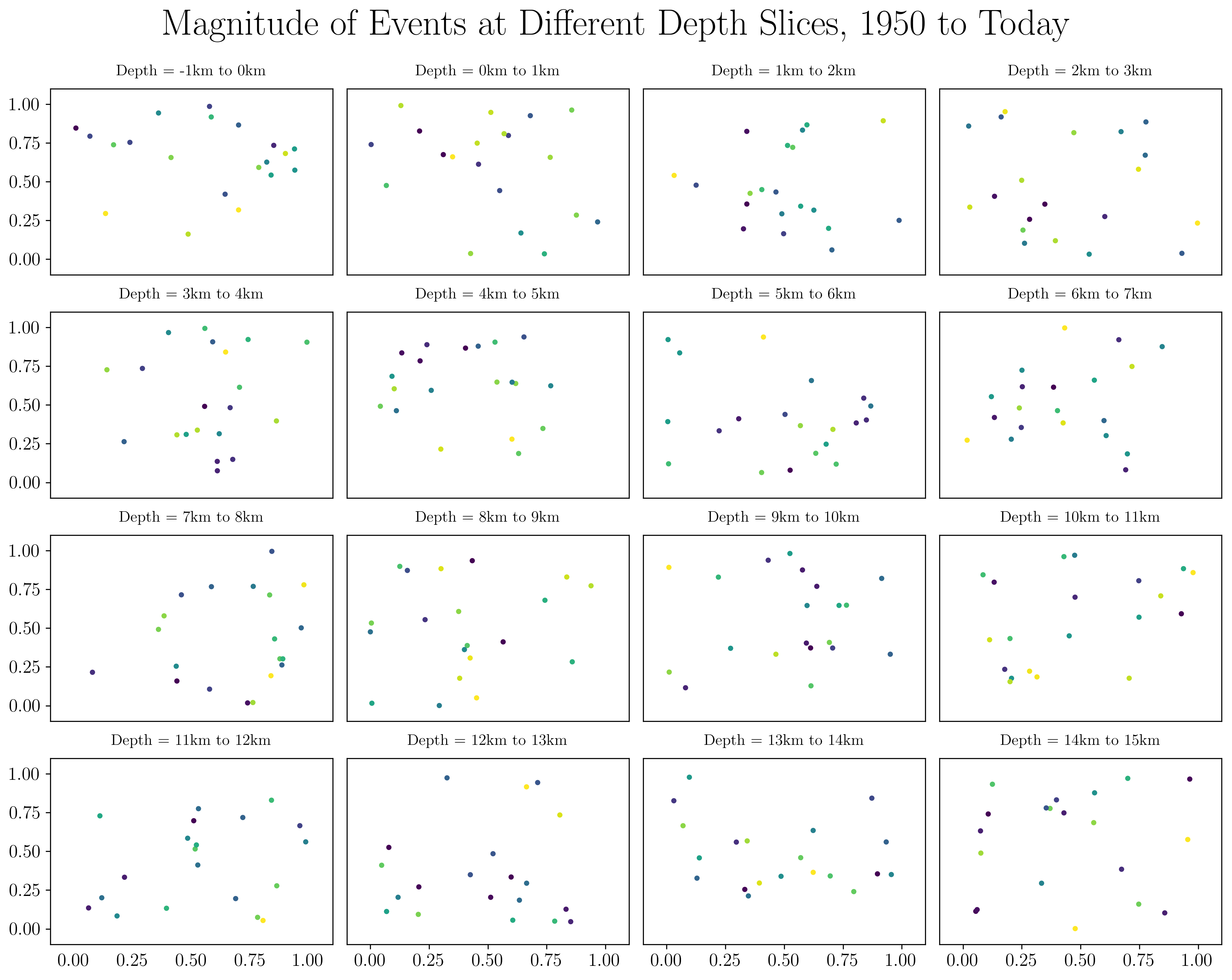 我正在绘制地震学数据,并正在创建一个由16个不同深度切片组成的图形。每个子图显示震中的lat/lon,颜色被缩放到它的大小。我想做两件事: