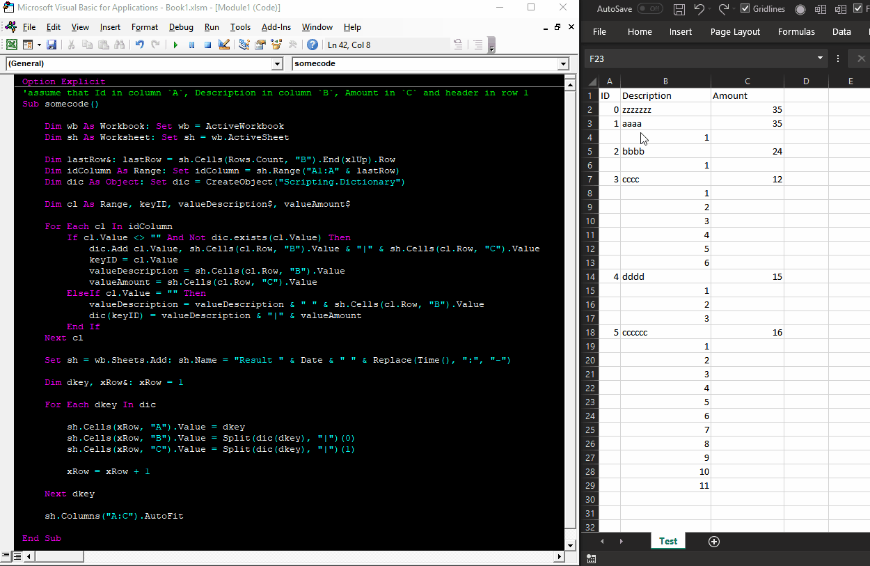 'assume that Id in column `A`, Description in column `B`, Amount in `C` and header in row 1